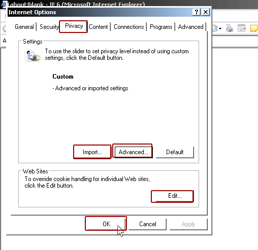 Optiuni generale de operare cu cookies pentru MSIE 6 poti alege in Tools/Options/Privacy. Aici poti alege un nivel predefinit de intimitate ("privacy"), mutand cursorul din chenarul numit Settings, sau poti administra operarea cu cookies pentru anumite situri, folosind butonul Edit din chenarul Websites.
