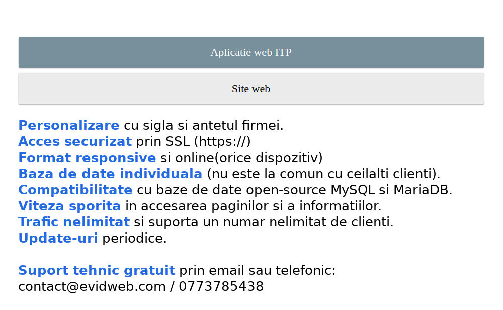 Suport si asistenta online prin email contact@evidweb.com, prin SMS sau la telefon.Trafic nelimitat